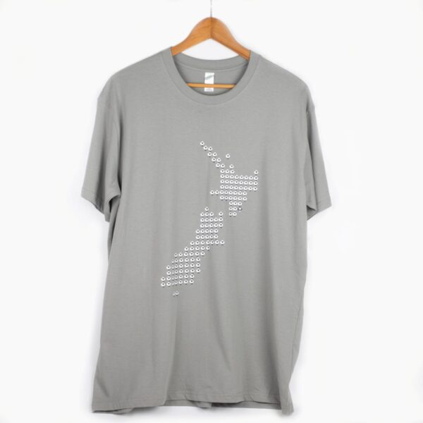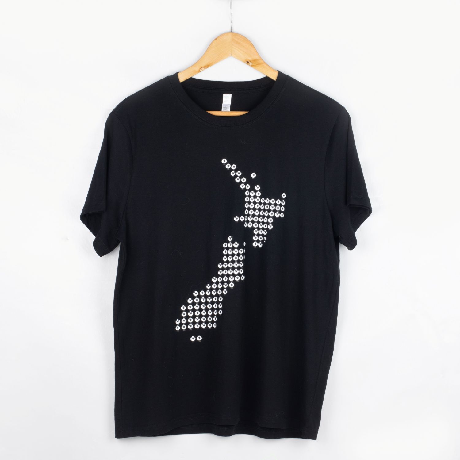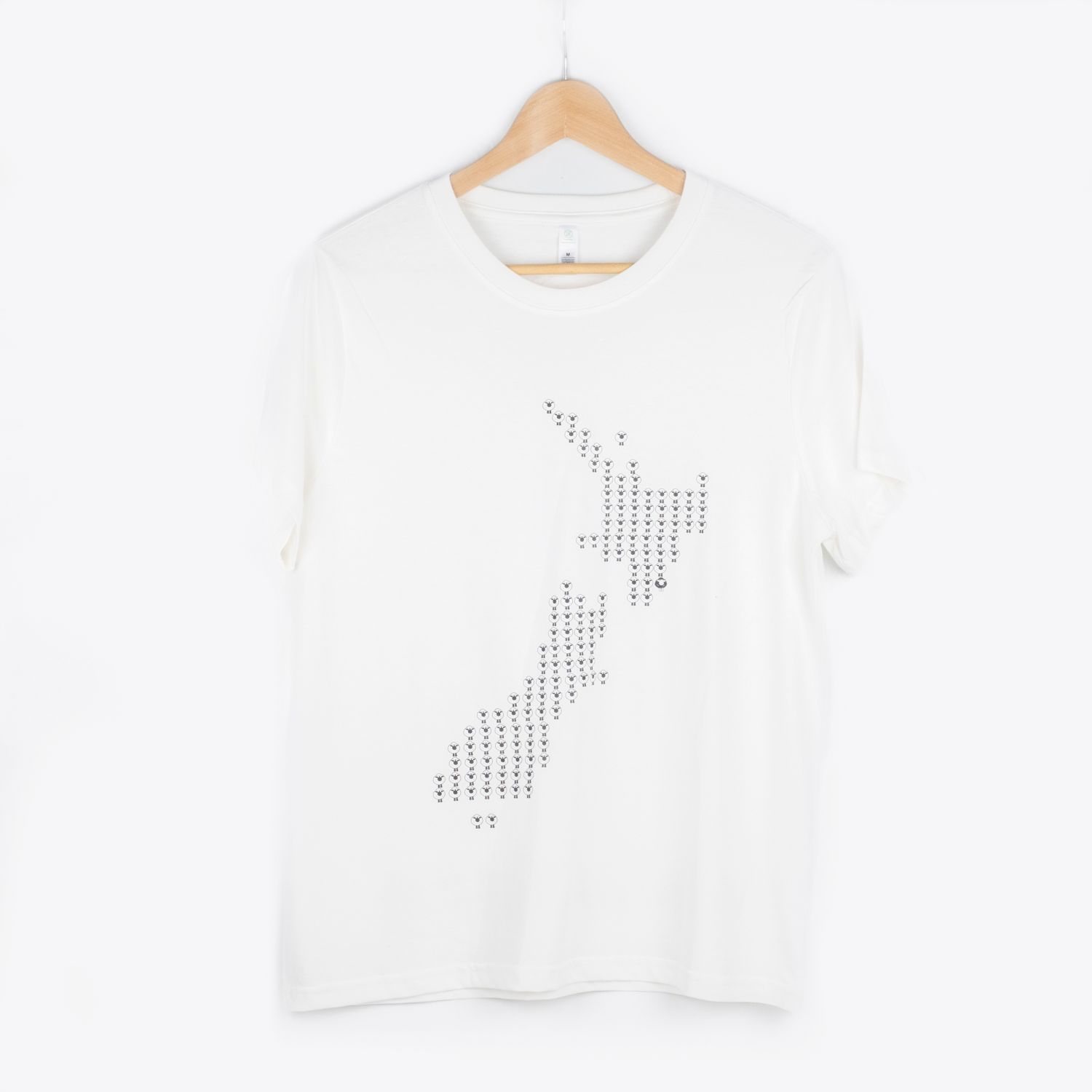 Our organic soft cotton T-Shirt features a design created by Patrizia to illustrate the location of the Wairarapa by cleverly using one of her favourite farm animals…. the coloured sheep.